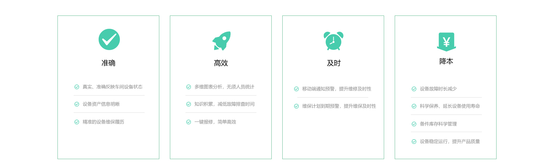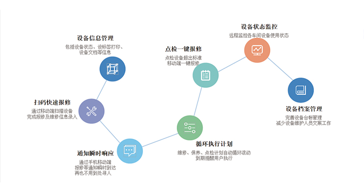 ① 设备信息管理             ② 扫码快速保修             ③点检一键保修             ③ 通知瞬时响应             ④ 循环执行计划             ⑥设备状态监控             ⑦ 设备档案管理