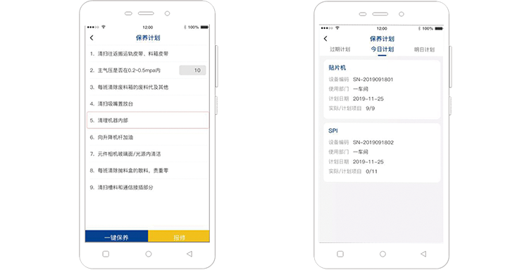 ① 支持多种计划方式:周期、、、间隔、、、生产次数              ② 保养情况日历表,,直观展示             ③ 计划逾期项目置顶,,,,颜色标识区分              ④ 支持移动作业方式 (扫码确认保养点检内容)