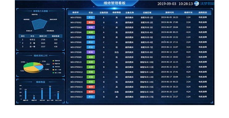 ① 维修信息:实时显示未完成的维修工单信息、、、进行看板预警             ② 设备效率:进行设备OEE的统计分析,,,,提高设备管理